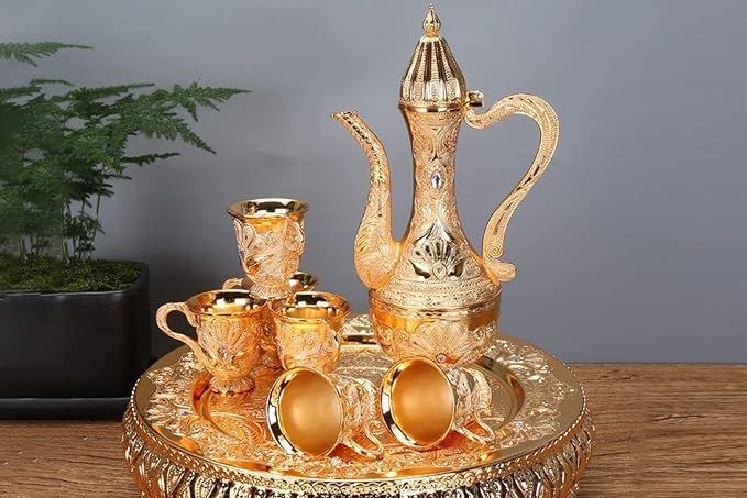 This set joins the ritual of Turkish coffee with the elegance of wine service in one unified package. With a traditional copper cezve/coffee pot, 6 matching cups, and a golden wine decanter + glasses set, it offers both functionality and decorative appeal—perfect for festive gifting or elevating your home-entertaining game. With quality materials and artisan finishes, it stands out more than typical kitchenware. Just be sure to check the lining, materials, and intended use (decorative vs functional) before purchase.