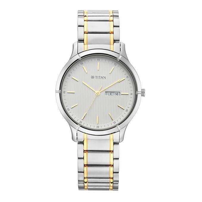 The Titan NT1775BM02 is a men’s analog wristwatch from the “Lagan” collection that blends refined elegance with practical functionality. It features a dual-tone silver-and-gold metal bracelet, a white dial with clean indexing, and day & date windows for added utility. A versatile timepiece that works just as well at the office as for more formal occasions—its clean design, day/date functionality and dual-tone bracelet make it a great value for someone seeking a dependable, stylish watch without going into premium price tiers.