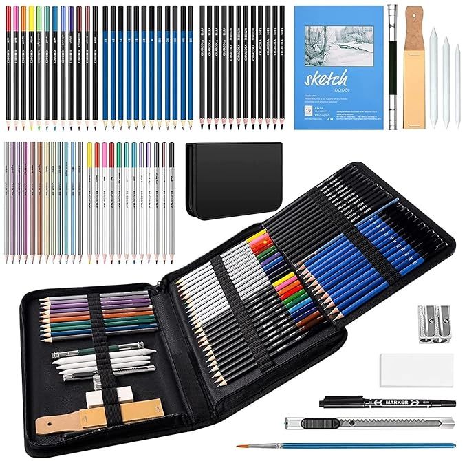 Drawing kit 75 Drawing Pencil Set Include : 12 Sketching Pencil, (5h, 4h, 3h, 2h, Hb, B, 2b, 3b, 4b, 5b, 6b, 8b,) 12 Charcoal Pencil (Soft, Medium, Hard,) 12 X Oil Based Coloured Pencil, 12 X Watercolour Pencil,12 X Metallic Coloured Pencil, 3 X Blending Stumps, 1 X Metal Sharpener, 1 X Vinyl Eraser, 1 X Pencil Expender, 1 X Sandpaper Block, 1 X Artist Brush, 1 X Permanent Marker, 1 X Craft Knife, 1 X A5 Sketch Book, Pencil Kit Drawing Set. Art kit Extra Art Accessories – Professional art tools can make your art level reach new heights.Include 3 Blending Stump, Metal Sharpener, Vinyl Eraser, Pencil Extender, Sandpaper Block, Artist Brush.All basic drawing tools allow you to start creating at any time.